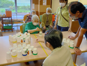 集中力が途切れません。皆さん、真剣な眼差しで最後の紙コップを運んでいます!
