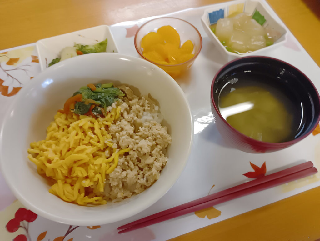 10月20日の献立は比較的家庭でもお馴染みの三色丼の登場です。