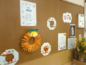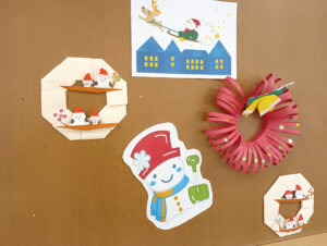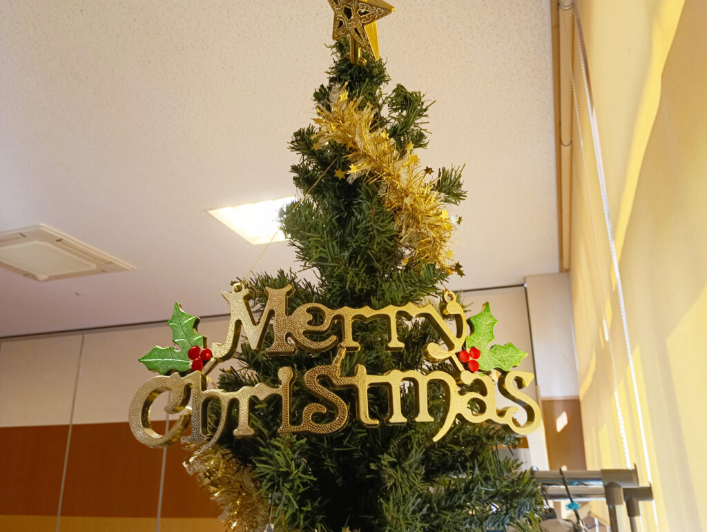 クリスマスならではのリースの壁画とクリスマスツリーを飾って、