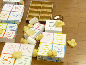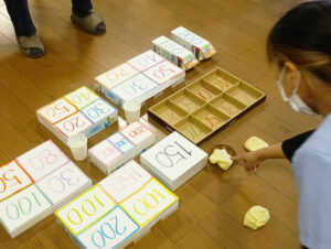 お手玉は全部で12球使用し、得点の書かれた箱を狙って投げていきます。