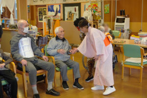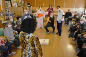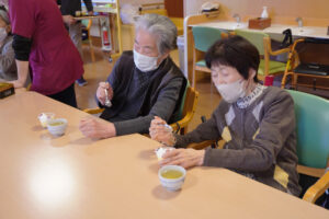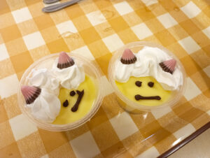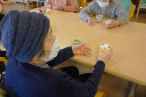 楽しい節分レクの後は、手作りおやつ「職員特製!鬼のプリン🍮」の登場!